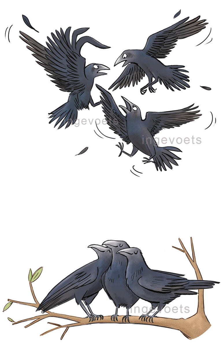 Tekening voor de Duitse uitgeverij Klett, lesboek taal bij een gedicht over het gedrag van kraaien.